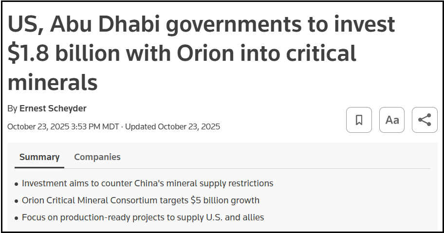 On Oct 23, 2025—The U.S. and Abu Dhabi governments will invest $1.8 billion into mining and refining projects across the globe with private equity fund Orion Resource Partners to bolster Western access to lithium, rare earths and other critical minerals. The proposed partnership underscores Washington’s efforts to challenge China’s dominance in critical metals and rare earth elements. According to sources familiar with discussions, parties would contribute equal amounts to achieve a combined total of $5 billion over time.