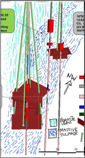 Here’s the kicker: Drill holes 250 and 563 reported encountering distinct 100 meter zones of 2-10% semi-massive disseminated sulphides (chalcocite and bornite) in veining structures above each of their respective high-grade intercepts. Notably, the same semi-massive mineralization was also encountered above the high-grade mineralization in hole 565. All three holes proved a thick envelope of semi-massive chalcocite-bornite occurs within vein structures and disseminations draped above what appears to be multiple stacked horizons of pooled massive sulphides.