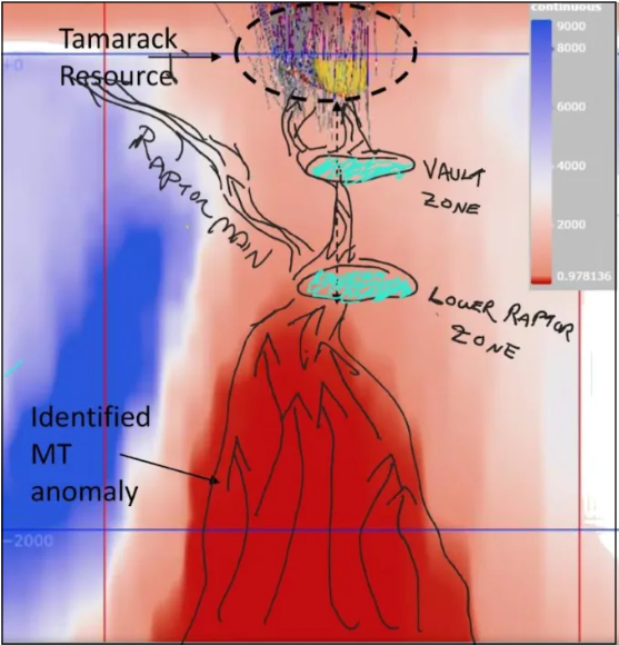 If the BHEM and MT anomalies in the Lower Raptor Zone are confirmed as a deeply rooted zone of structurally controlled massive sulphides, the Noril’sk analog of a giant magmatic nickel system would undoubtedly be validated, and the Tamarack deposit would be in line to become one of the most important polymetallic ore bodies on the planet.