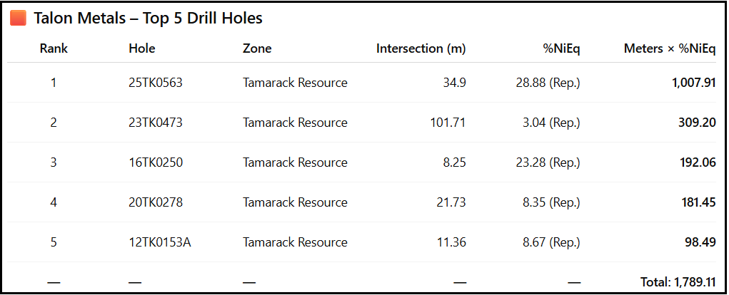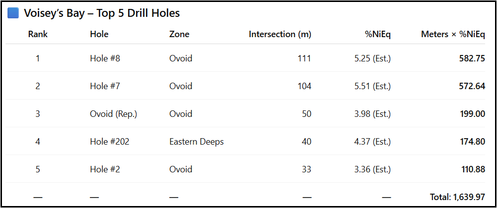 Let’s compare the top 5 best holes of the Voisey’s Bay deposit, a world-class magmatic nickel ore body in Labrador, Canada, versus Talon’s Tamarack deposit in Minnesota.