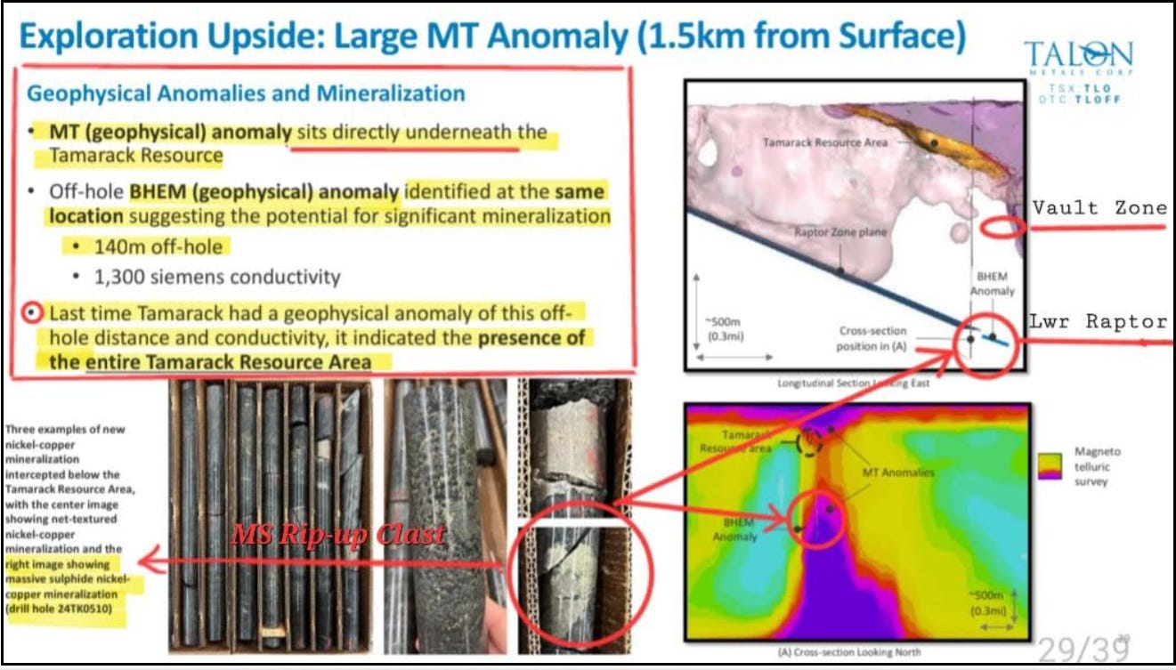 Slide 29 (pictured two images above) possibly the most important slide of the corporate presentation reveals the significance of hole 24TK0510 and the coincident BHEM and MT anomalies deep into the heart of the system. In this slide Talon states the “last time Tamarack had a geophysical anomaly of this off-hole distance and conductivity, it indicated the presence of the entire Tamarack Resource Area.”