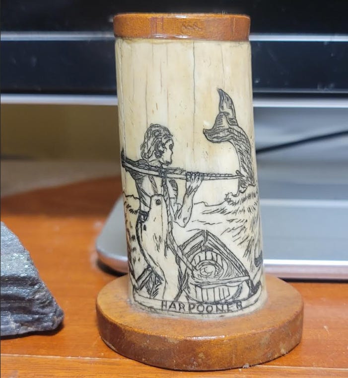 The name “Whalehunter” came to me while sitting at my desk, staring at a scrimshaw piece my late grandfather—a logger, fisherman and historian of the West Coast of British Columbia—had inscribed into bone. It depicts a scene with a harpooner and a whale, a traditional art form where sailors engraved images onto whale ivory or bone during the 18th and 19th centuries.